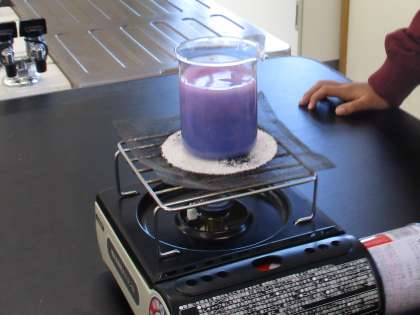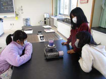 温度が上がると色が変わる示温インクで水に色をつけて、実験用ガスコンロで温めました。火の当たるところから、温まった水が上に上がっていく様子がよく分かり、子供たちは、その現象に驚きの声が上げていました。