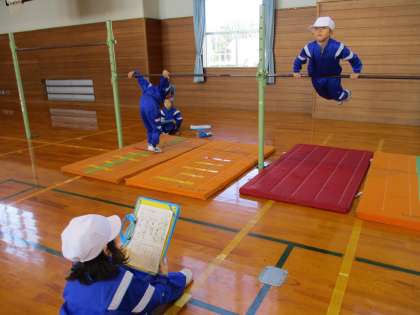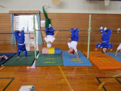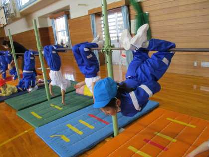今日は技をつないで練習しました。何度も練習するうちに「つばめ」のように体がピンと伸びるようになり、「こうもり」から「こうもりふり」もできるようになりました。できる技がどんどん増えています。