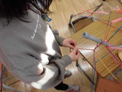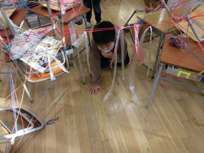 今日は図画工作科「ひもひもワールド」の作品作りに取り組みました。ひもでアスレチックを作ったり、飾り付けをしたりするなど、子供たちは想像豊かに作っていました。
