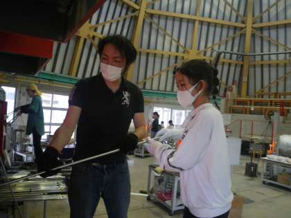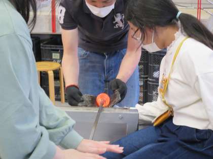 1300度の熱で溶かしたガラスを巻き付け、冷やします。