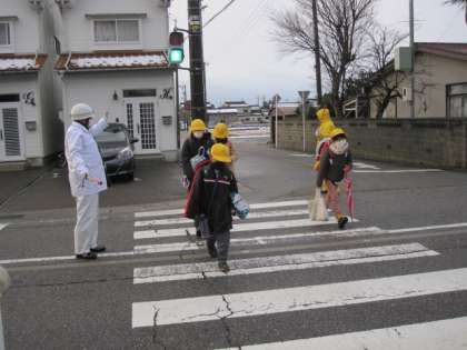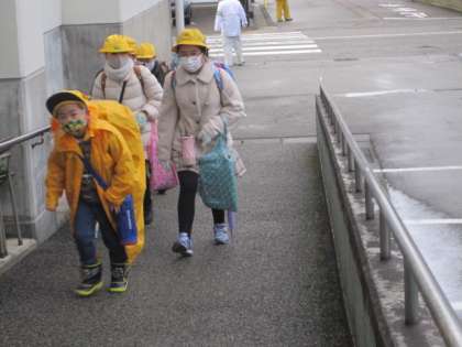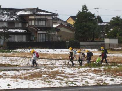 はまっ子たちは今日も元気に登校しています。土日の雪が通学路のあちらこちらで見られ、子供たちは雪を触ったり、つかんだりして楽しそうです。