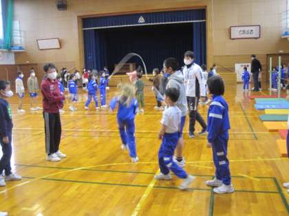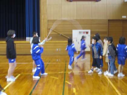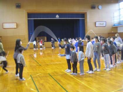2限後ののびのびタイムには、体育館に集まって長なわに挑戦しています。