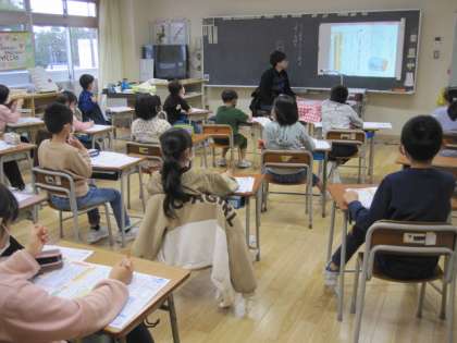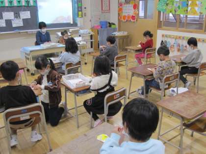 1年生は折り紙をしていました。お楽しみ会の準備のようです。