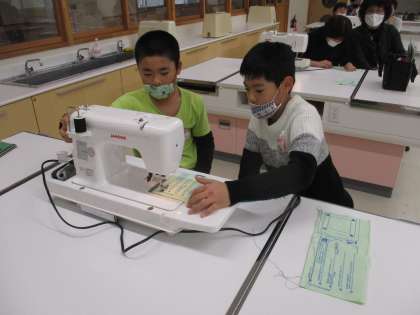 5年生は、初めてミシンを使った縫い物に挑戦しました。