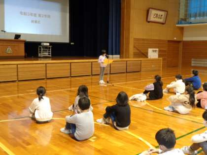 式の後、3年生の代表児童が2学期の振り返りを発表しました。苦手だった教科を努力して克服したりできることが増えたりしたことを聞き、全校みんなで喜びました。また、1年生全員の音読もありました。