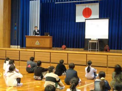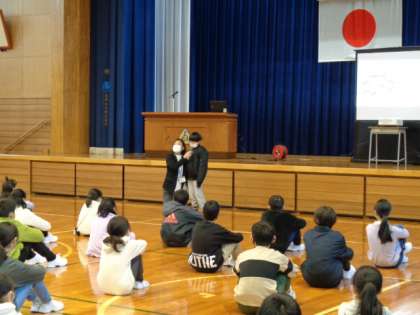 始業式では、校長先生から「3学期は、未来の自分のために勉強をがんばってほしい」とお話がありました。未来でしたい仕事に必要な知識は、今の小学校の勉強とつながっています。3学期は短いですが、今の学年の学習内容をしっかり勉強することと、いろんな人と仲良くすることが大切だと教わりました。子供たちは、スライドを見ながら真剣にお話を聞いていました。