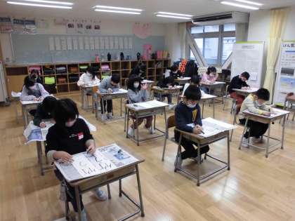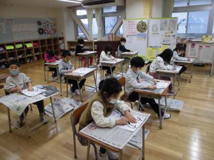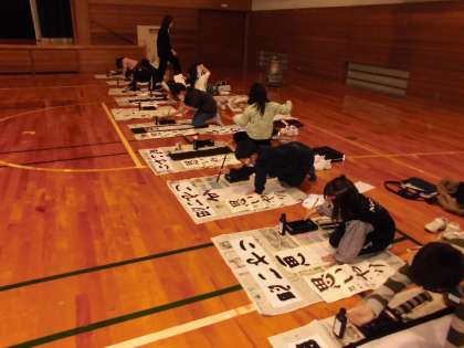 始業式の後は、書き初め大会です。1年生、2年生は教室で、3年生からは体育館で行いました。緊張した雰囲気で1字1字ていねいに書いていました。