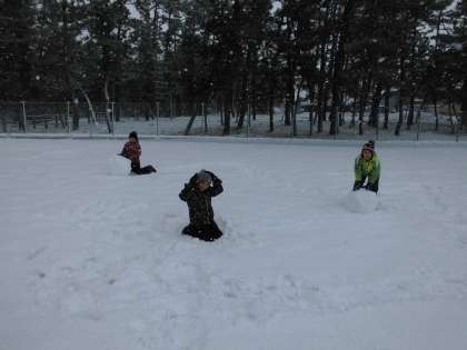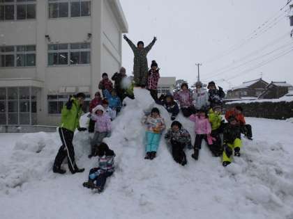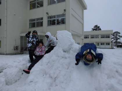 今日はみんなで雪遊びをしました。大きな雪だるまを作ったり、滑り台を勢いよく滑り降りたりするなど、楽しく活動しました。