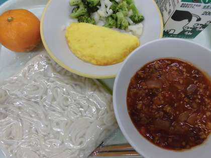 ミートソースの中には、普段あまり見かけないレンズ豆が入っていましたね。気が付きましたか?花野菜サラダは、さっぱりしていて箸休めにちょうどよかったです。今日もおいしかったですね。