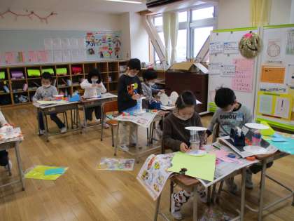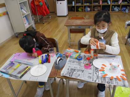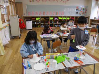 「かみざらコロコロ」の活動です。紙皿と紙コップを使って楽しく転がるものを考えて作っています。何度も転がして試しながら模様を描いたり飾りを付けたりして工夫しています。
