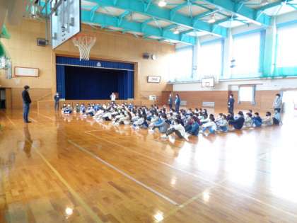 今日は昼の清掃時間に避難訓練を行いました。校舎内各場所に散らばって清掃している時に火災発生の想定です。体育館に集合完了。落ち着いて静かに行動できました。