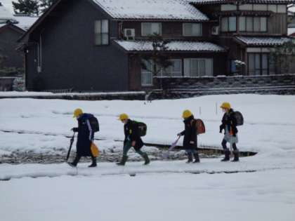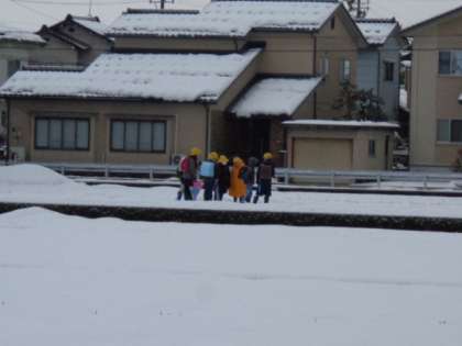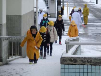 今日は5、6年生のいない集団登校です。3、4年生が班を並べて歩いています。歩くのに疲れた1年生を囲んで励ます姿も見られました。はまっ子たちは今日も元気です。