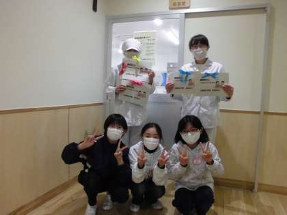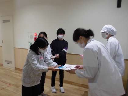 今週1週間は、給食週間でした。この1週間、健康委員会の子供たちは、お昼にくわしく献立の紹介をしたり、調理員さんへのお手紙を紹介したりしてきました。今日は、全校のみんなで書いたお手紙を代表で調理員さんに渡しました。調理員さんが笑顔で受け取ってくださって、とてもうれしかったですね。これからもおいしい給食を食べて元気いっぱい過ごします。