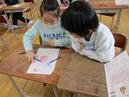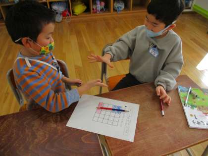 「どちらがひろい」の学習でじんとりゲームをしています。ジャンケンで勝った方がマスを1つ塗るという簡単なゲームです。じんとりをした後は、どちらが何マス広いかを答えます。ひき算も合わせた勉強になりました。