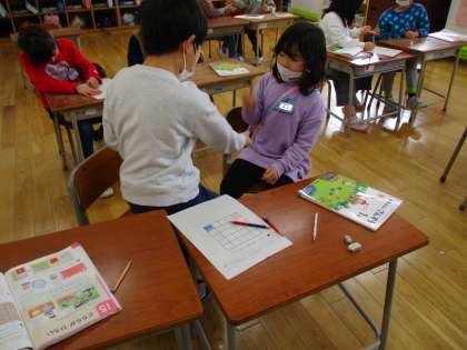 「どちらがひろい」の学習でじんとりゲームをしています。ジャンケンで勝った方がマスを1つ塗るという簡単なゲームです。じんとりをした後は、どちらが何マス広いかを答えます。ひき算も合わせた勉強になりました。