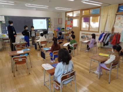 1年生は授業開始のあいさつ「はじめましょう」をするところです。とても大きな声です。