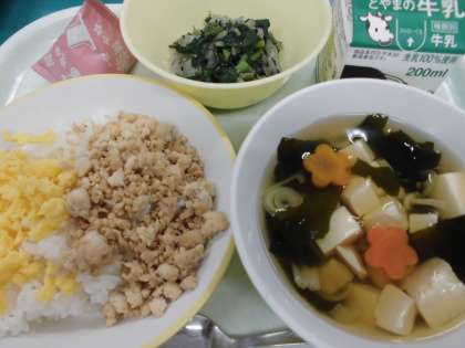 ごはんに鶏そぼろと炒り卵をのせたそぼろ丼が、とてもおいしかったです。また、一足早くひな祭りにちなみ、ひなあられが出ました。彩りのきれいな華やかな給食となりました。
