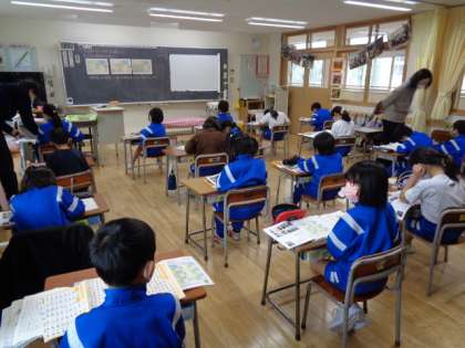 2年生は算数。3つに分けた大きさを表す説明をしています。