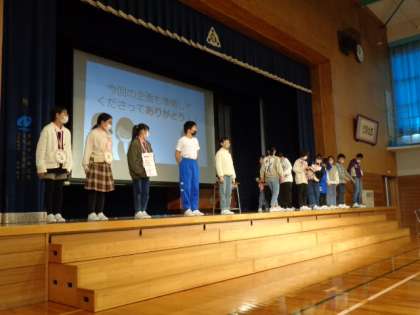 6年生から在校生にお返しの出し物がありました。それぞれの学年のいいところ紹介です。6年生の子供たちから見た1〜5年生のいいところに、うなずくばかりです。学校全体をよく見ていてくれていたのだなと思いました。言われている1〜5年生の子供たちもうれしそうな顔をしていました。