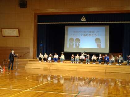 最後に校長先生からお話と歌のプレゼントがありました。お話だけでなく歌も歌ってくださり、6年生を始めみんな、とても驚き喜んでいました。自然と手拍子も打っていました。6年生は晴れやかに退場して行きました。