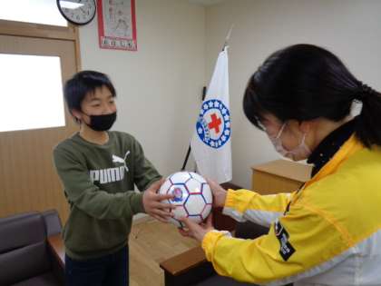 明治安田生命ではカターレ富山とともに、子供たちの健全な育成を支援するため、地元の小学校・中学校にサッカーボールを寄贈する活動を行っています。本日、本校にもそのサッカーボールが届けられ、代表児童が受け取りました。ありがとうございました。