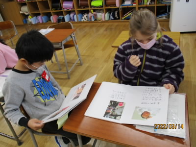 今日は、いろいろな友達と、互いの絵本を読み合い、感想を伝え合いました。