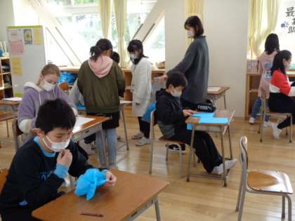 4年生は花紙で花を作っていました。
