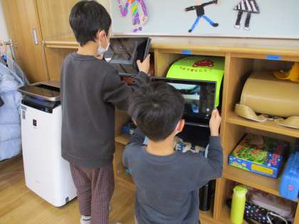 今日はすきまちゃんを作って、「すきまちゃんのすきなすきま」を見付けて置き、クロムブックで撮影しました。子供たちが「すきまちゃん」に話しかけながら、すきまを探して置く姿が可愛らしかったです。