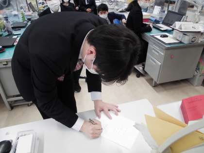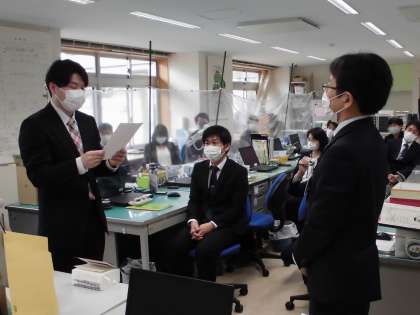 年度初めの職務スタートにあたって、今年度本校に着任しました新規採用教員の宣誓を行いました。地方公務員法第31条に定められた服務の宣誓です。法にしたがって責務を深く自覚し、誠実かつ公正に職務を執行することを誓いました。それを見守った教職員も初任の頃を思い出し、改めて襟を正す思いでした。