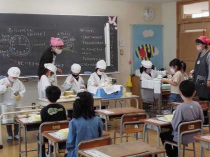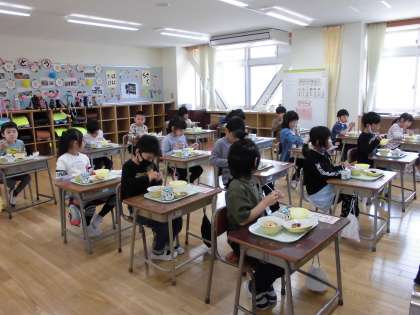 1年生は入学して初めての給食です。最初に小学校での給食のやり方について、担任の先生から話を聞きました。いよいよ、自分たちで配膳です。子供たちは、自分の役割をしっかりと行っています。