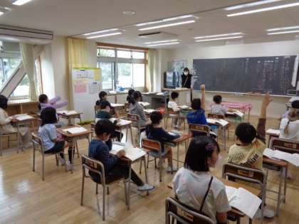 1年生は図書室での活動から戻り、連絡帳を書くところです。