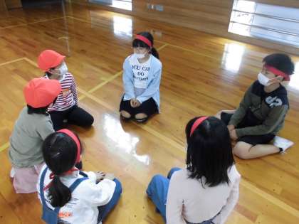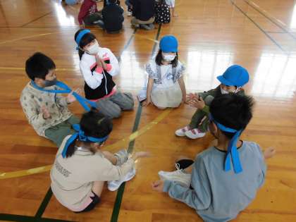 運動会結団式の後、縦割り班でゲームなどで楽しんで仲よく遊びました。