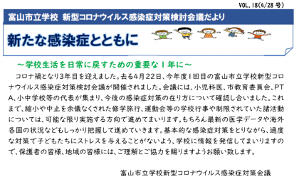 「富山市立学校 新型コロナウイルス感染症対策検討会議だより」18号が発行されました。コロナ禍3年目。学校生活を日常に戻すために富山市立学校新型コロナウイルス感染症対策会議で話し合われた内容が書かれています。保護者の皆様には5月2日にお子様を通して配付する予定ですが、本ホームページで見ることができます。右側のコーナー、または下の部分をクリックしてください。なお、右のコーナーではこれまでのバックナンバーも見ることができますのでご利用ください。