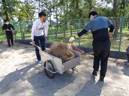 育友会主催の親子除草が行われました。今年度は草の量が少ないこともあり、執行部の皆さんと野球チームの浜黒崎エンジェルスの皆さん、教職員で行いました。日差しがしだいに強くなる中、作業を行いました。おかげでグラウンドはとてもきれいな状態になりました。