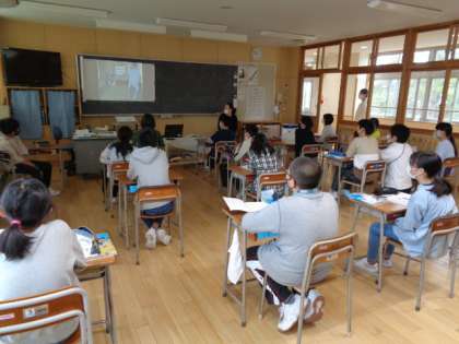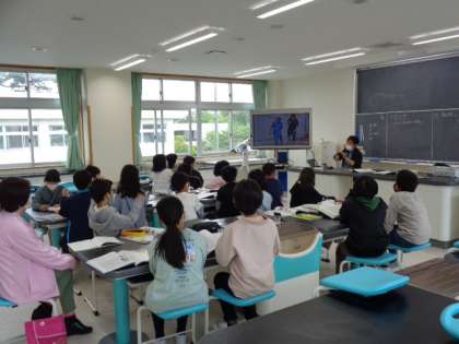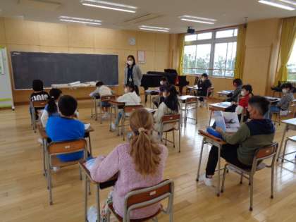 5年生は音楽。「こいのぼり」の歌について話をしています。