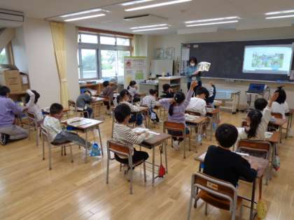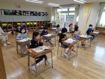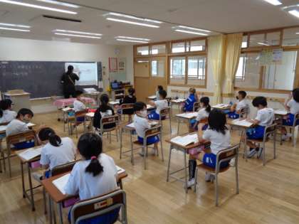 2年生は音楽。「たぬきのたいこ」手をたたいて拍子を感じています。