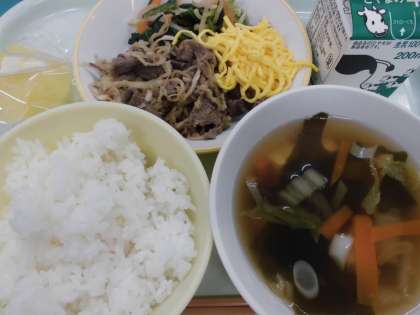 お皿の焼き肉・ナムル・錦糸卵をごはんにのせてどんぶりにして食べました。冷凍リンゴは、今日の暑さにぴったりでした。