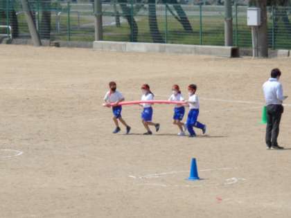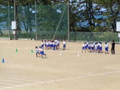 3年生と4年生は合同体育。運動会の練習です。海から波の音と涼風が届き、気持ちいい時間です。