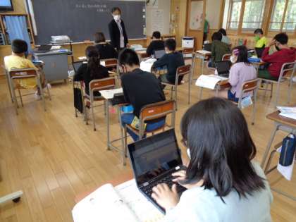 6年生は家庭科。生活時間についてクロムブックを使って学習しています。