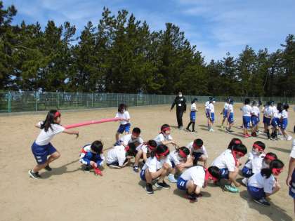 4年生との合同体育、2回目です。昨日練習したことを実際にグラウンドでやってみました。なかなか同じ団のみんなとタイミングが合わず、上手にタイフーンが進みませんでした。今日は各団で話し合いをくり返し、何度も練習しました。