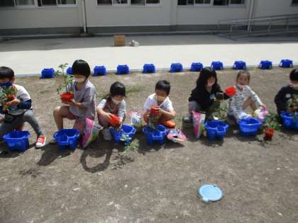 5月10日、11日の生活科の時間に「ミニトマト」「キュウリ」「ピーマン」「枝豆」「オクラ」「ナス」「スイカ」の苗を植えました。