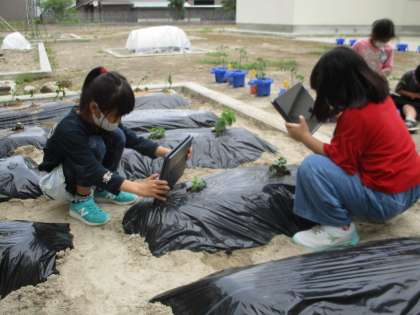 「大きく育ってほしい」や「たくさんとれるといいな」という願いを込めた畑が完成し、「丁寧に育てたい」と意気込んでいました。観察記録のためにクロムブックを使って写真を撮りました。
