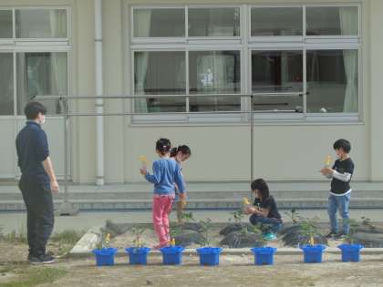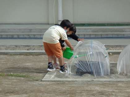はまっ子たちは今日も元気に登校しています。児童玄関開錠の7時55分を過ぎると子供たちが入ってきます。すぐに中庭に出て、水やりをしていました。