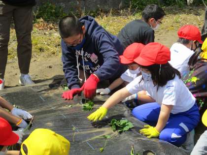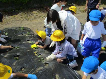 今日はさつまいもの苗植えを行いました。6年生の子供たちは、下級生に寄り添いながら植え方を教えたり、一緒に穴を掘ってあげたりするなどリーダーとしての姿がたくさん見られました。また、最後には、丁寧に水やりを行い、最後まで責任をもって取り組んでいました。