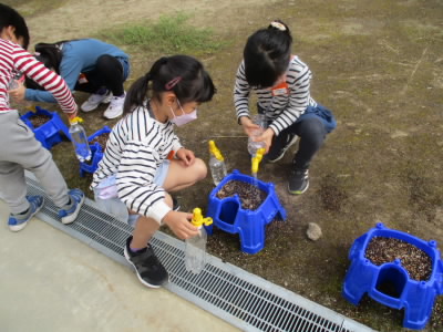 今日の朝、みんなで水やりにいくと、たくさんの植木鉢から芽が出ており、子供たちは大喜びでした。