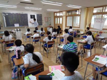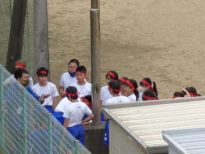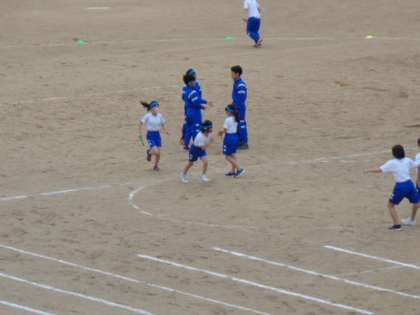 5年生、6年生は体育。リレーの練習をしたり、団で集まり作戦会議をしたりしていました。