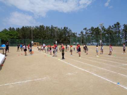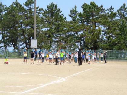3限目。全校児童が2団に分かれて応援練習を行いました。動きがそろうようになり、声も出ています。