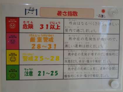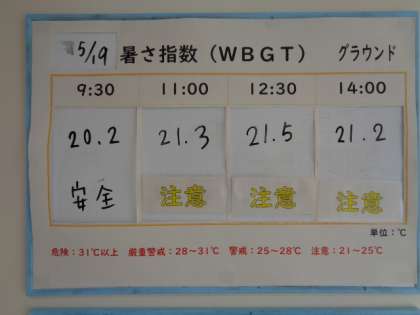 本校では、養護教諭が1日4回、黒球式熱中症指数計を使って暑さ指数(WBGT(湿球黒球温度)Wet Bulb Globe Temperature)を計測し掲示しています。WBGTは、熱中症を予防することを目的として1954年にアメリカで提案された指標です。必要に応じて全教職員で共有して熱中症予防に役立てています。