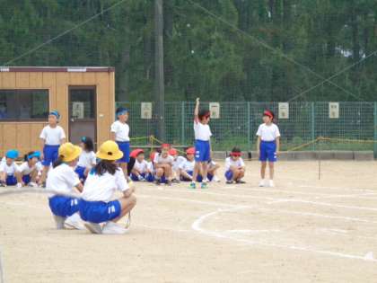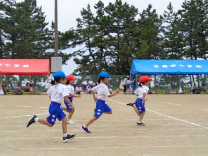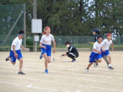 5年生、3年生、1年生の50m走です。スタートの時には名前を読み上げられ、大きな声で返事をしていました。懸命に走る姿に団席や保護者席から声援が送られています。