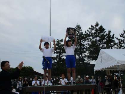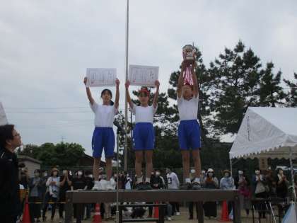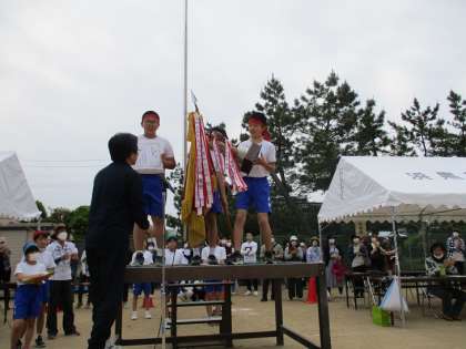 応援審査もわずかな差で赤団となりました。指揮台の上で高く掲げる優勝旗やトロフィー、賞状に大きな拍手がわき起こりました。子供たちのこれまでの努力がその拍手に表れているようでした。
